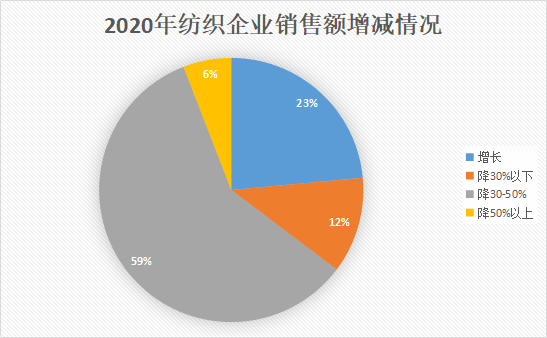 订单量的减少,还在企业整体销售额上有非常明显的表现。调研企业中,仅有23%的企业表示今年销售额是增长的,其他77%都不同程度的出现了下跌。 其中跌幅达到30-50%的企业最多,占比59%。另外还有6%的企业销售额直接腰斩,跌幅超过50%。不过依然有不少从事防疫面料生产的企业订单与销售额大幅增长。