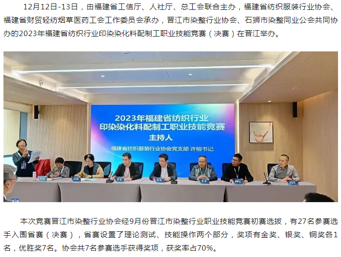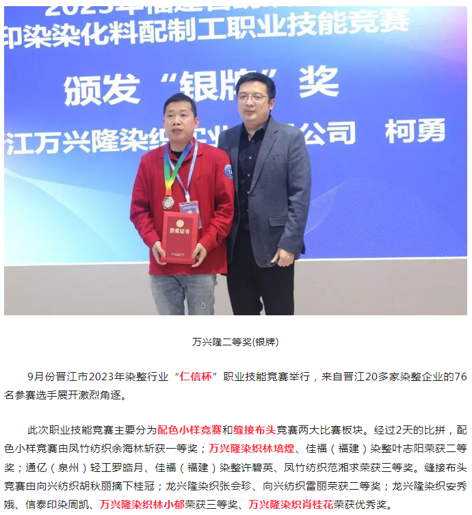 【喜报】2023年福建省纺织行业印染染化料配制工职业技能竞赛和晋江市染整技能竞赛万兴隆员工均荣获银牌
